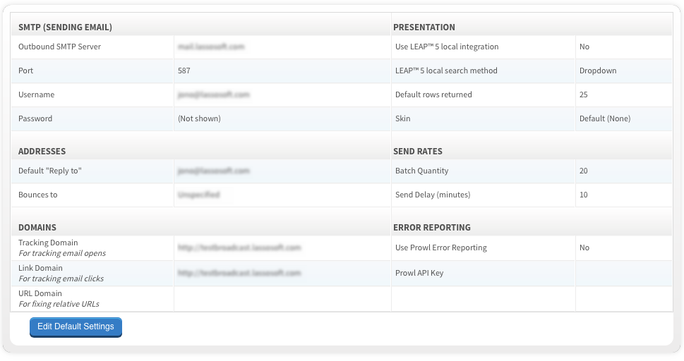 The "Default Settings" section in LassoMailer defines some of the basic behaviours of the system.
