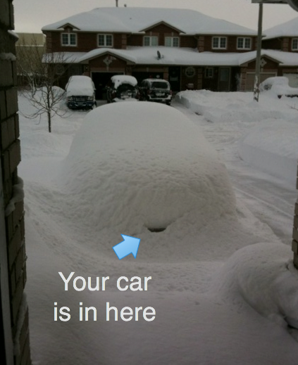 Today it snowed a bit up here in Canada. Jim couldn't find his car, so I sent him a picture of where to find it (yes, the picture on the left is really what's left of Treefrog-Jim's car).